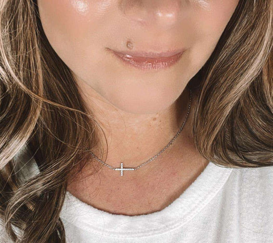 Sideways Cross Necklace- Shiny Sterling Silver and CZ