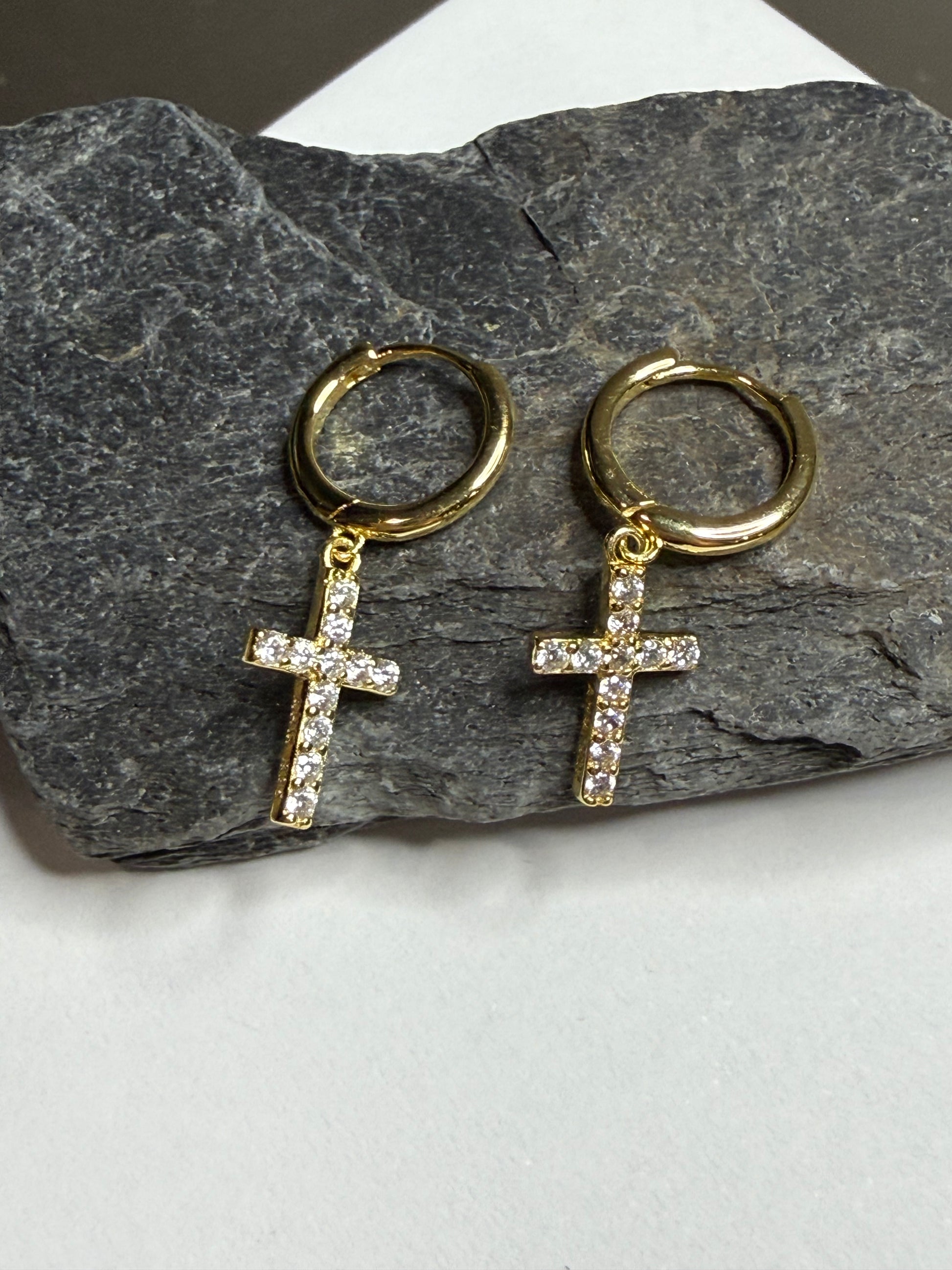 14 karat gold plated sterling silver hoop earrings with CZ cross drops. Hoops are 11.4mm in diameter with 1.3mm tubing. Crosses are 8.5mm x 12.5mm and feature 2mm CZ's. Hanging length is 25mm.