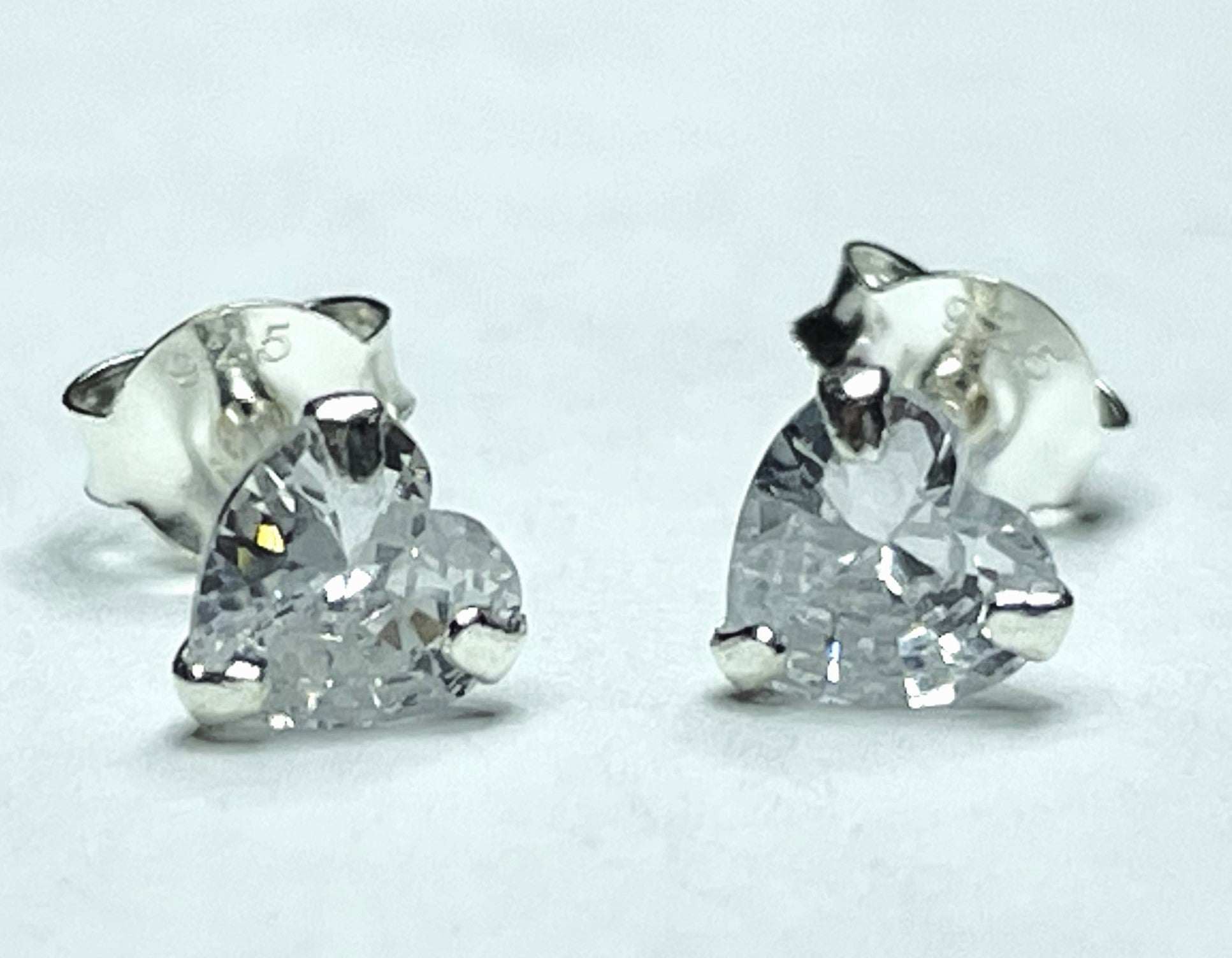 Small shiny sterling silver heart earrings feature 5mm x 5mm heart CZs.