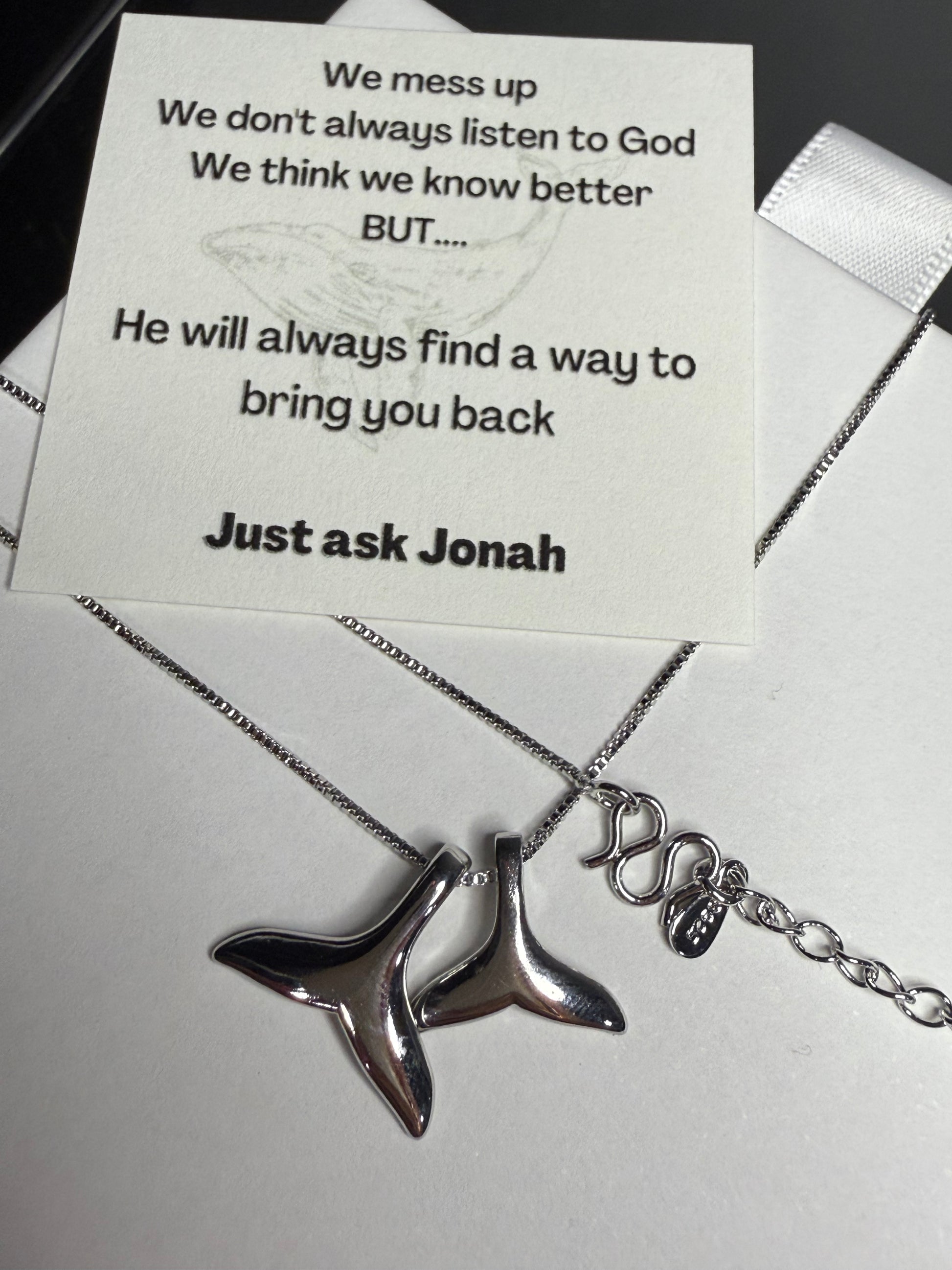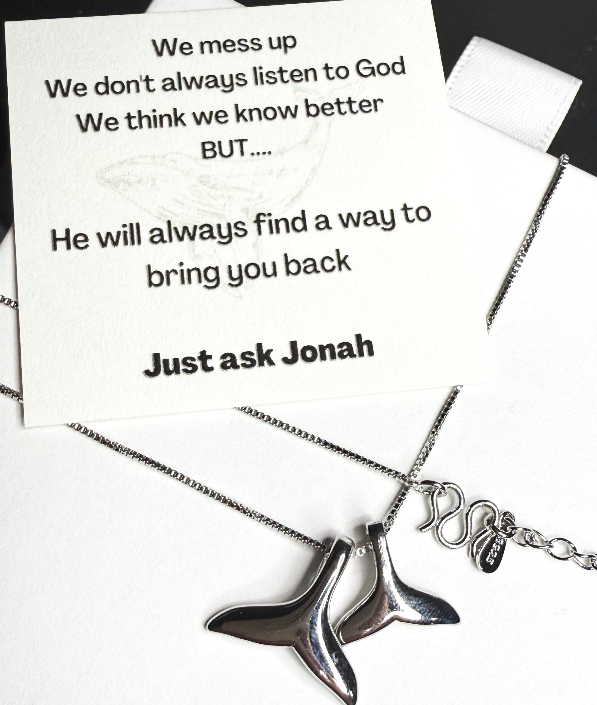 Jonah's whale necklace is .925 sterling silver with 2 whale tales and sterling silver box chain.