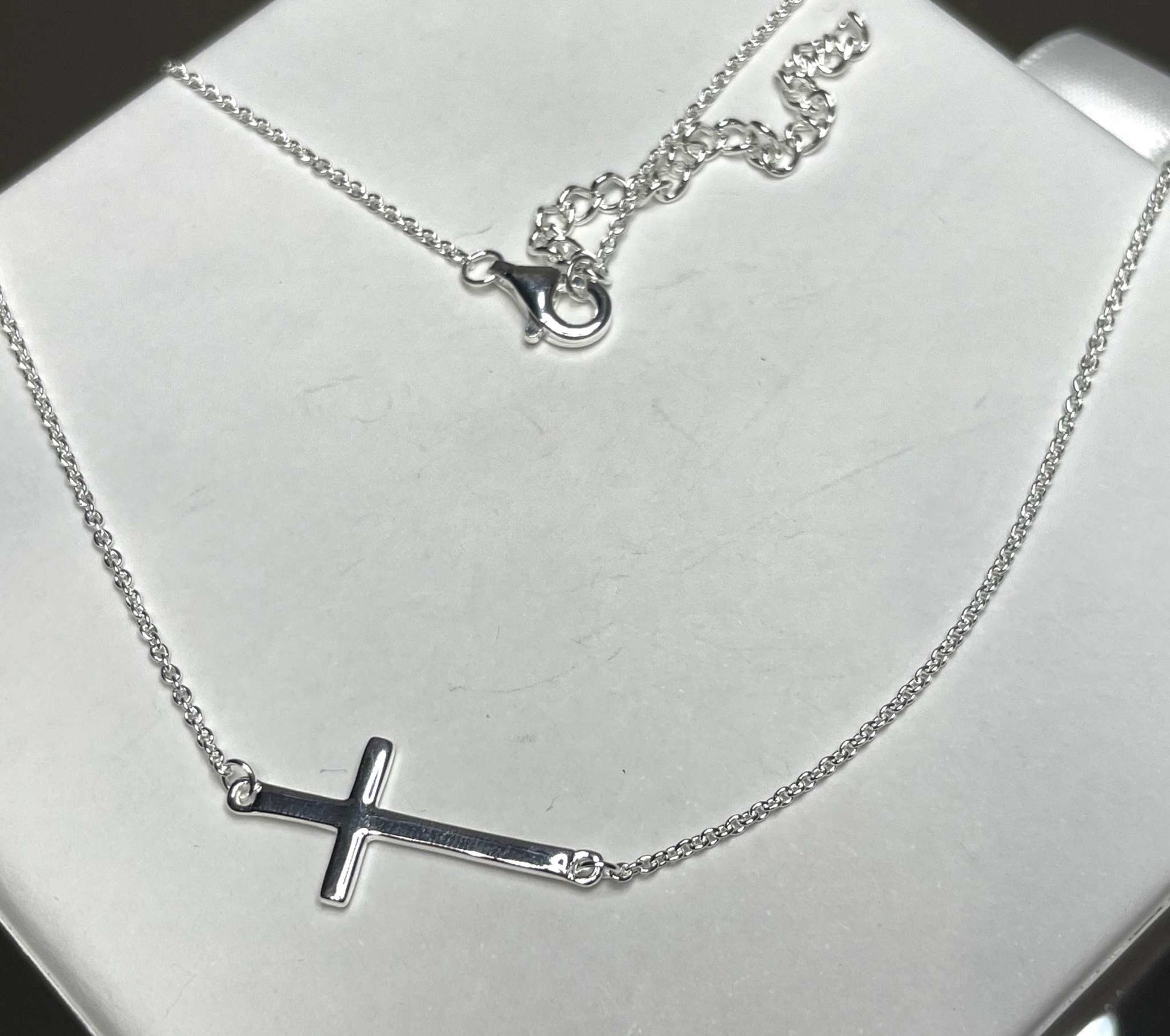- 16" + 2" extension sterling silver necklace with off center cross. The cross measures approximately 10.5mm x 23.5mm.